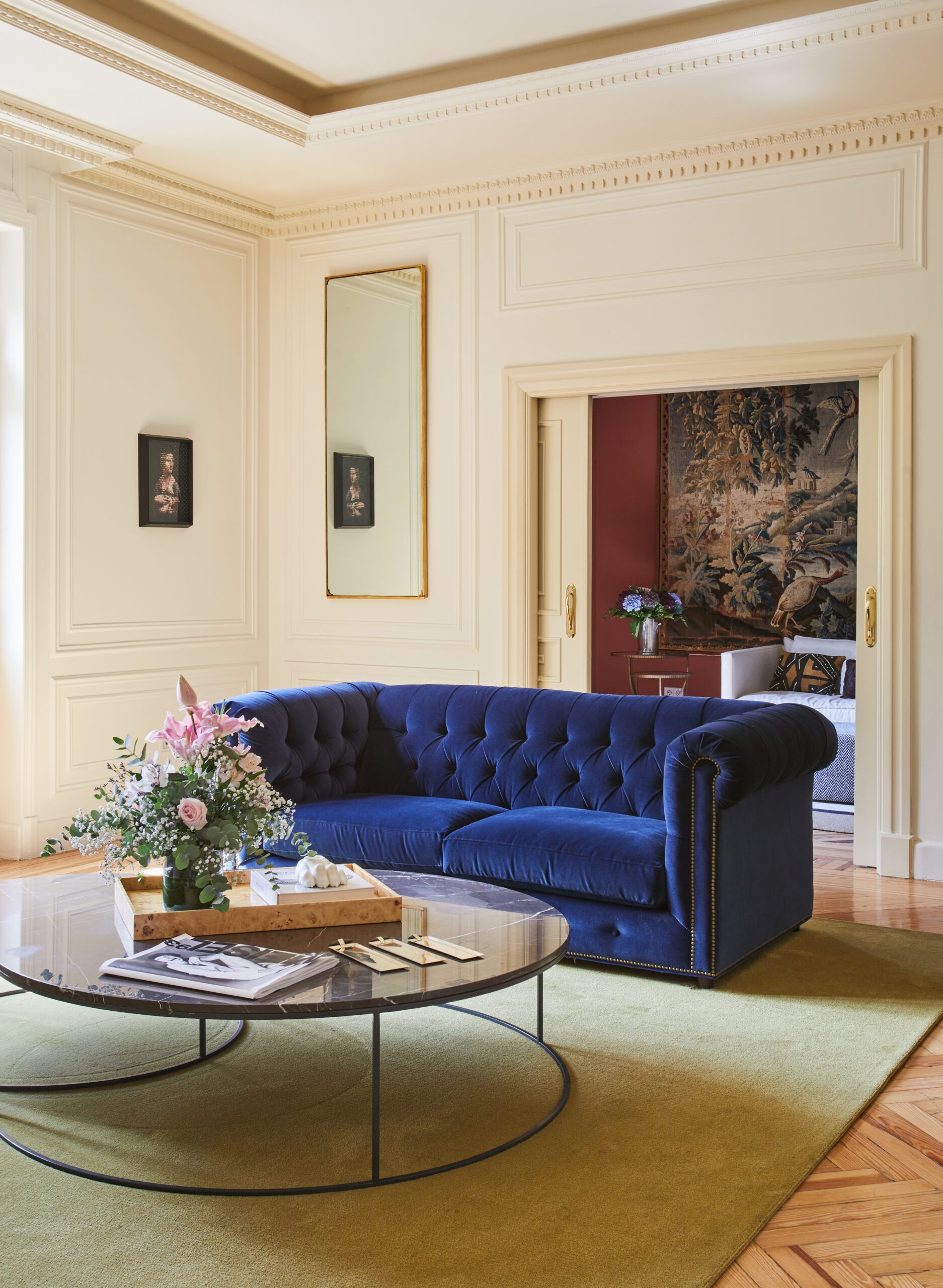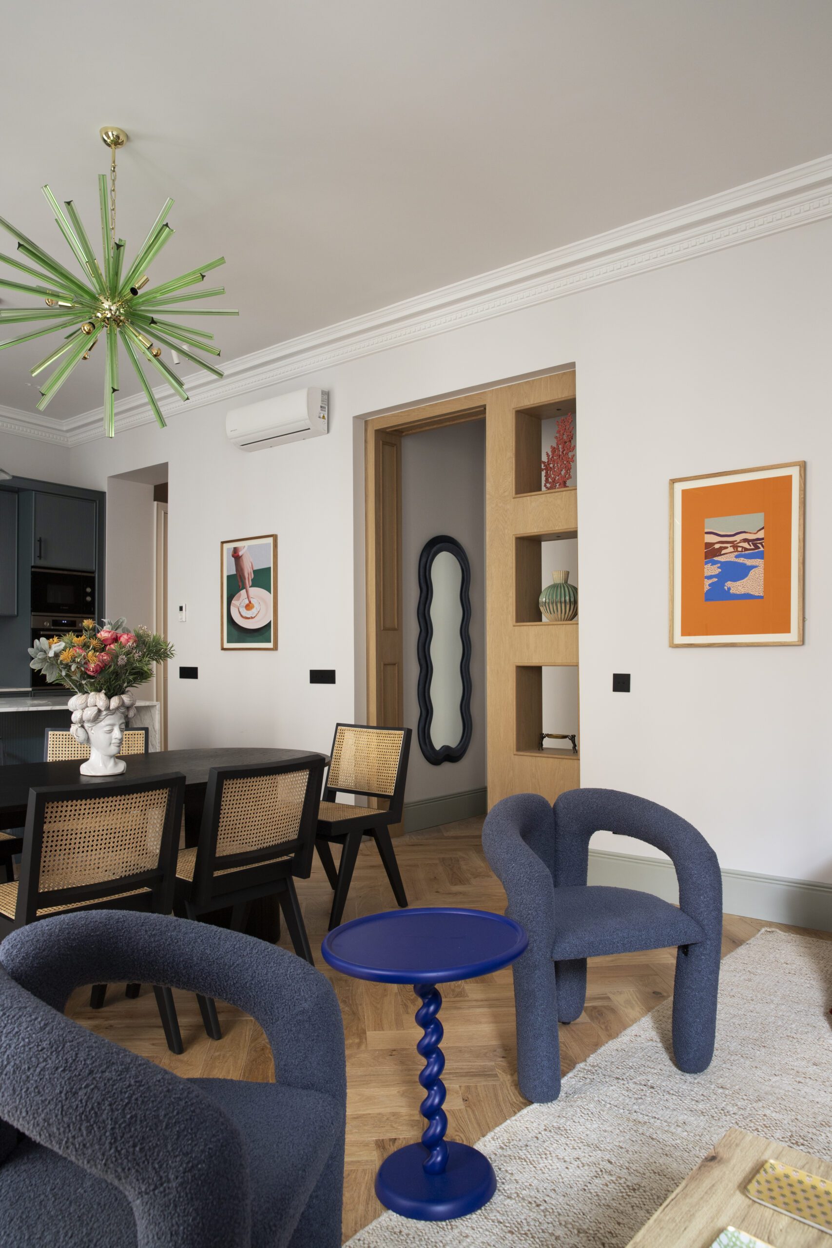 We discovered this old apartment on Hortaleza Street, right in the heart of Chueca, and immediately knew it had potential. With soaring ceilings, eight balconies overlooking the lively street, and a layout that flowed effortlessly, it was the perfect canvas for a chic pied-à-terre. Our vision: a compact yet striking home, infused with bold color, layered textures, and a playful mix of materials—ideal for a young couple or a group of friends.