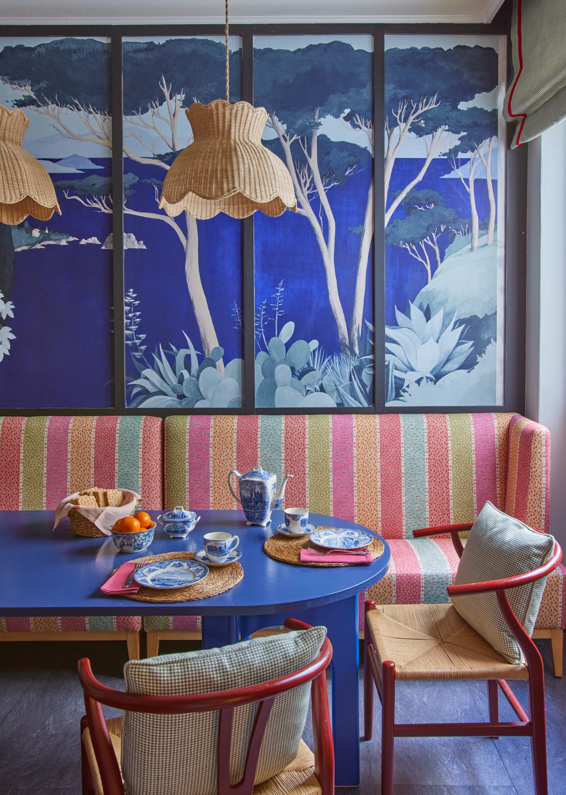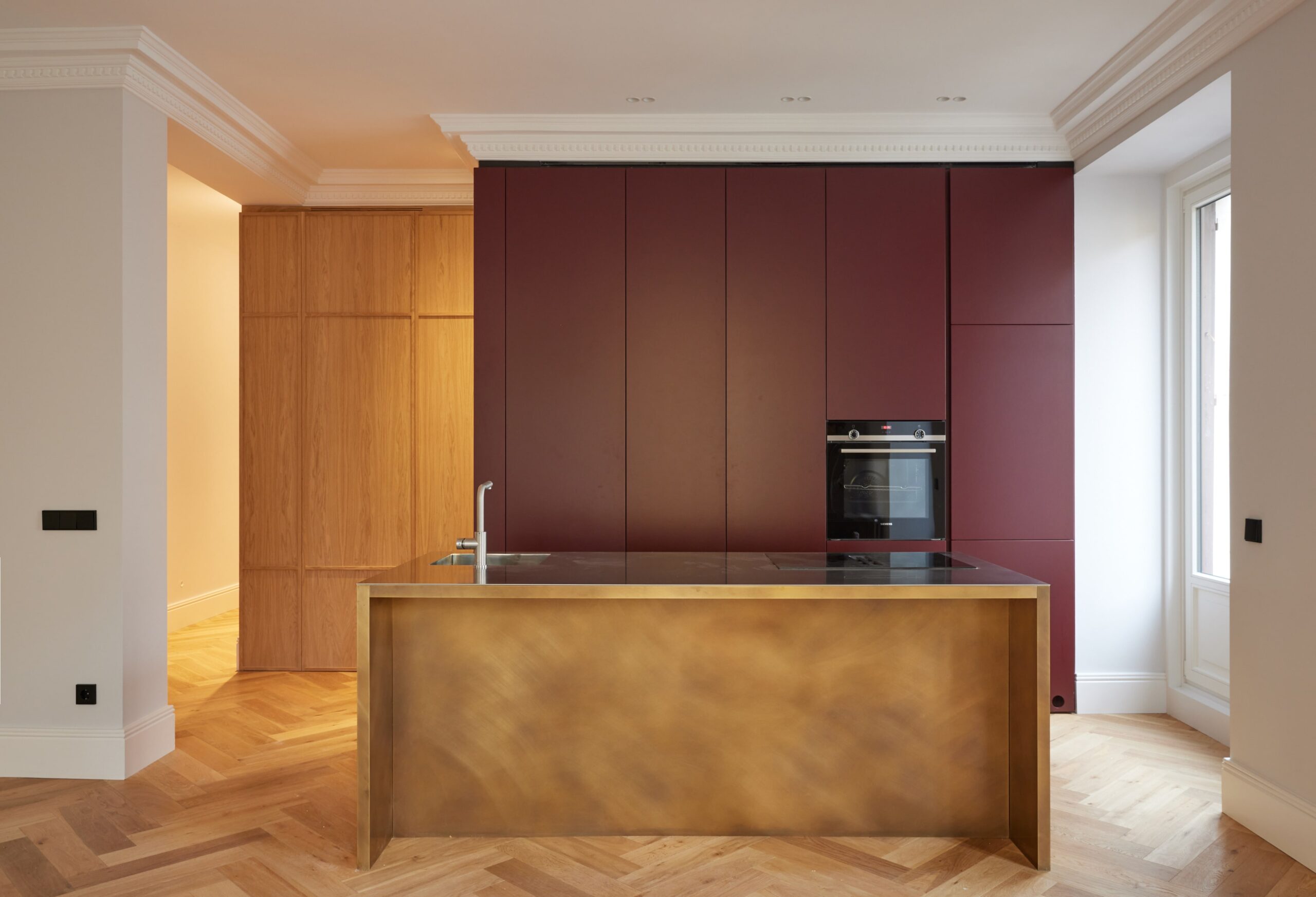 The kitchen became the heart of the project—a bold statement piece defined by deep burgundy cabinetry and a striking brass island. The combination of lacquered surfaces and warm metallic tones created a sense of drama, while still feeling practical and inviting.