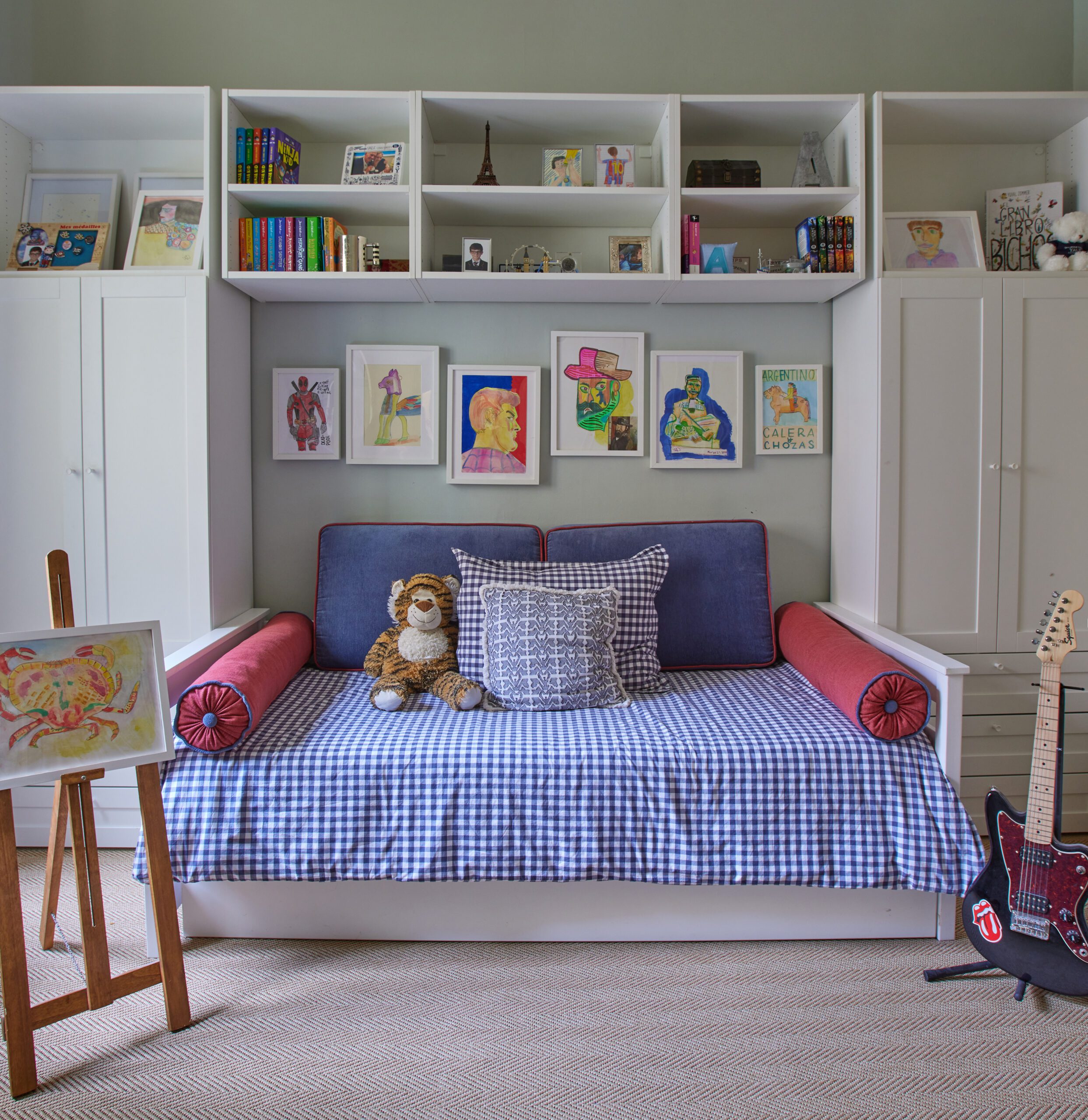 The main bedroom became another focal point of the project, where we paid special attention to every detail of the carpentry. We designed oval-paneled wardrobes, painted in a soft grey-taupe and finished with sleek, integrated handles for a modern yet timeless look. This room connects to a walk-in closet, where we reinterpreted the oval motif with a playful twist: wooden wardrobes lined in bold burgundy houndstooth fabric.